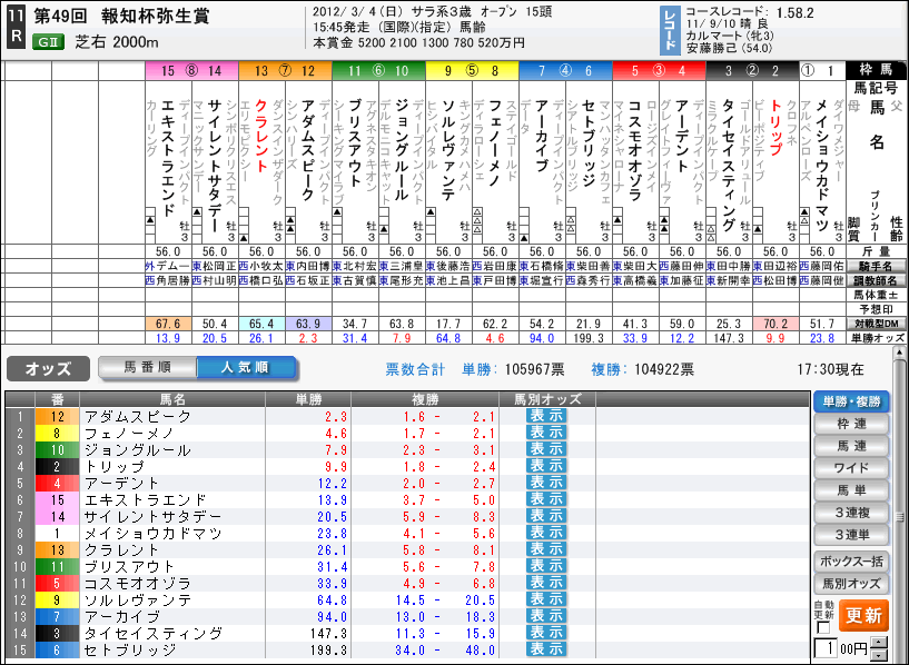 やはり1番人気はアダムスピークですね。まぁこれは予想できていたのでいいのですけど、なんとトリップが4番人気!個人的にはもっと上位にいってもいいと思うのですけどねぇ。まぁシメシメな感じという事でOKですね!それでは他馬のオッズも見ていきましょう。