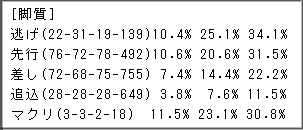 見てお分かりのように、マクリが複勝圏内に入ることはないと考えていいでしょう。逃げ、追い込みも切っていいと思います。