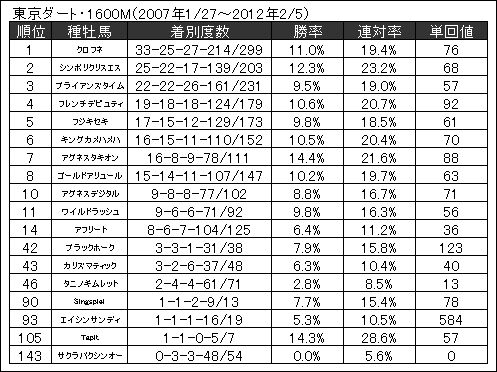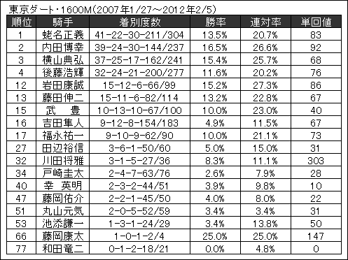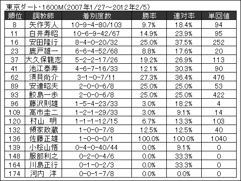 今回は東京・ダート1600Mにおける、騎手・調教師・種牡馬のデータを紹介させていただきました。どうぞ参考までに。