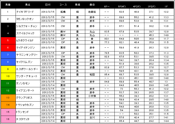 フェブラリーステークスの枠順が決定しましたね!注目のトランセンドは大外枠の15番。東京競馬場のダート左1600Mは芝スタートで、内と外では芝を走る距離が異なるのが特徴ですね。一般的には外枠の方が有利と言われていますが、芝でのダッシュが苦手な馬にはちょっと厳しいです。さぁそれでは早速出馬表と各馬の追い切りタイムを見ていきましょう。